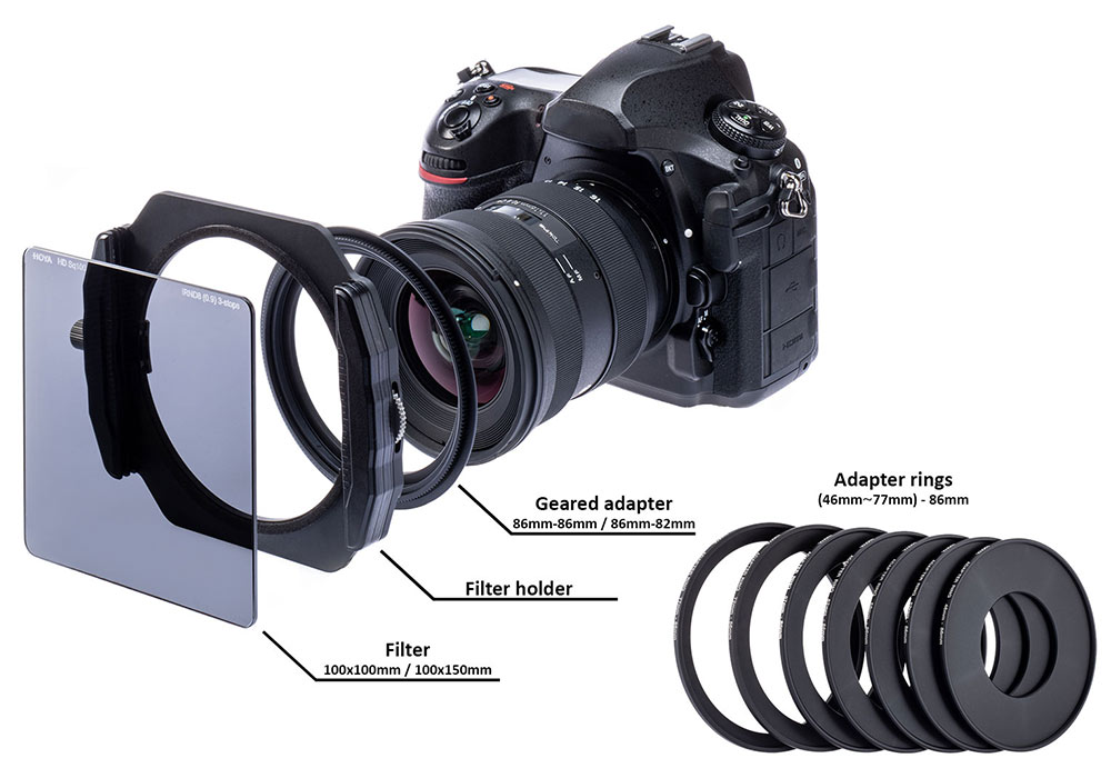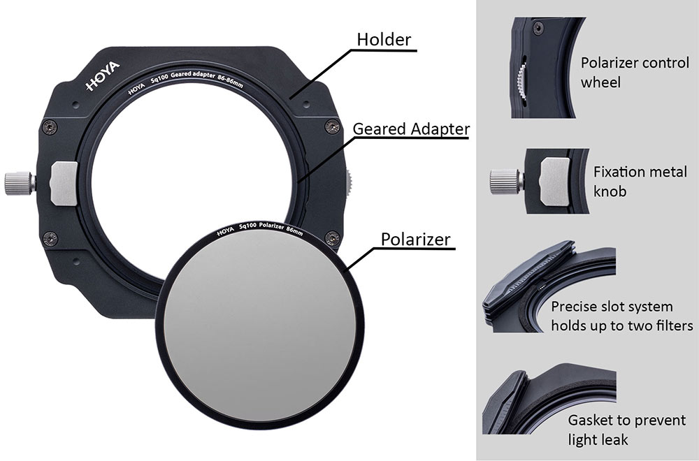 Hoya filter holder for square and rectangular filters of the Sq100 series, but it is also compatible with filters of 100mm width from other manufacturers.